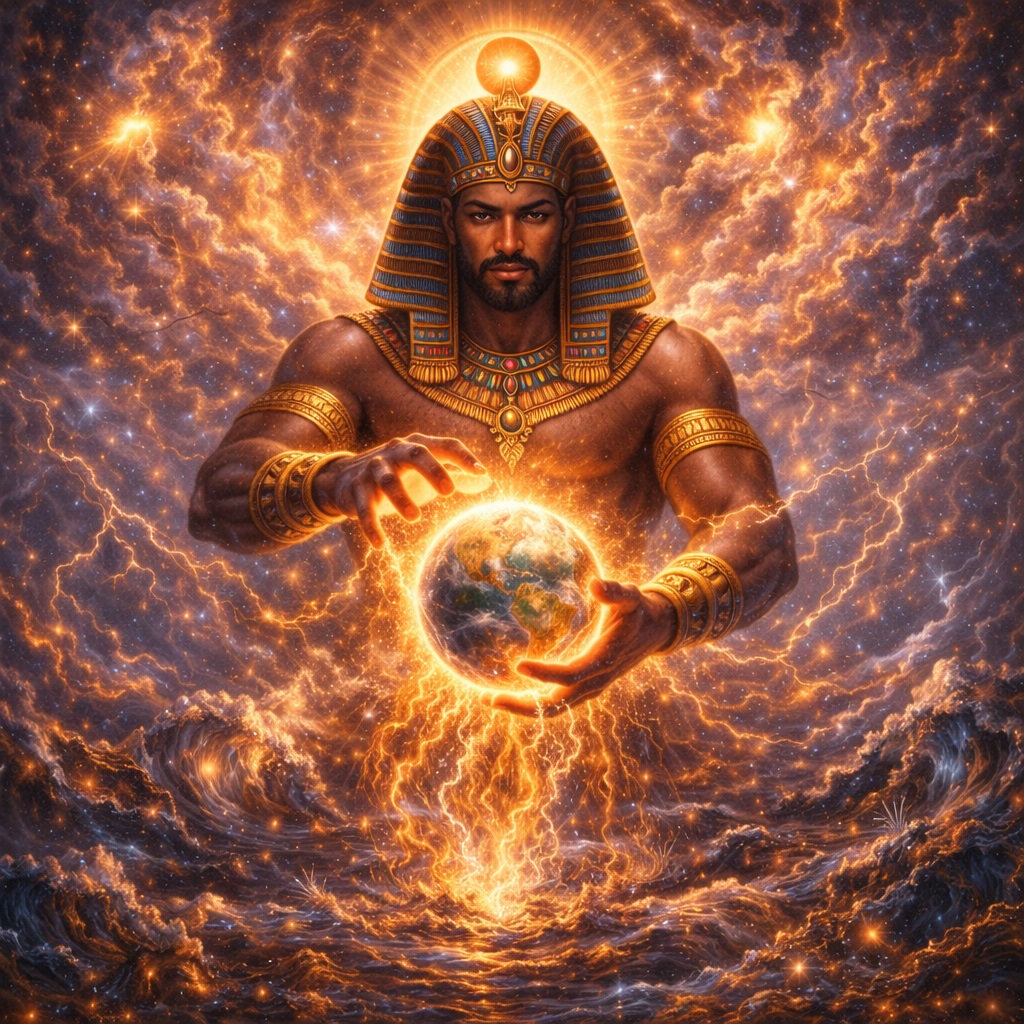 На этом фоне появление Атума становится ещё значительнее. Он возникает не из пустого пространства, а из сырой бесконечной потенциальности, где ещё нет ни верха, ни низа, ни времени, ни направления. Он — первое различие. Первый жест против бесформенности. Можно сказать ещё сильнее: Атум — это момент, когда хаос впервые перестаёт быть единственной реальностью.