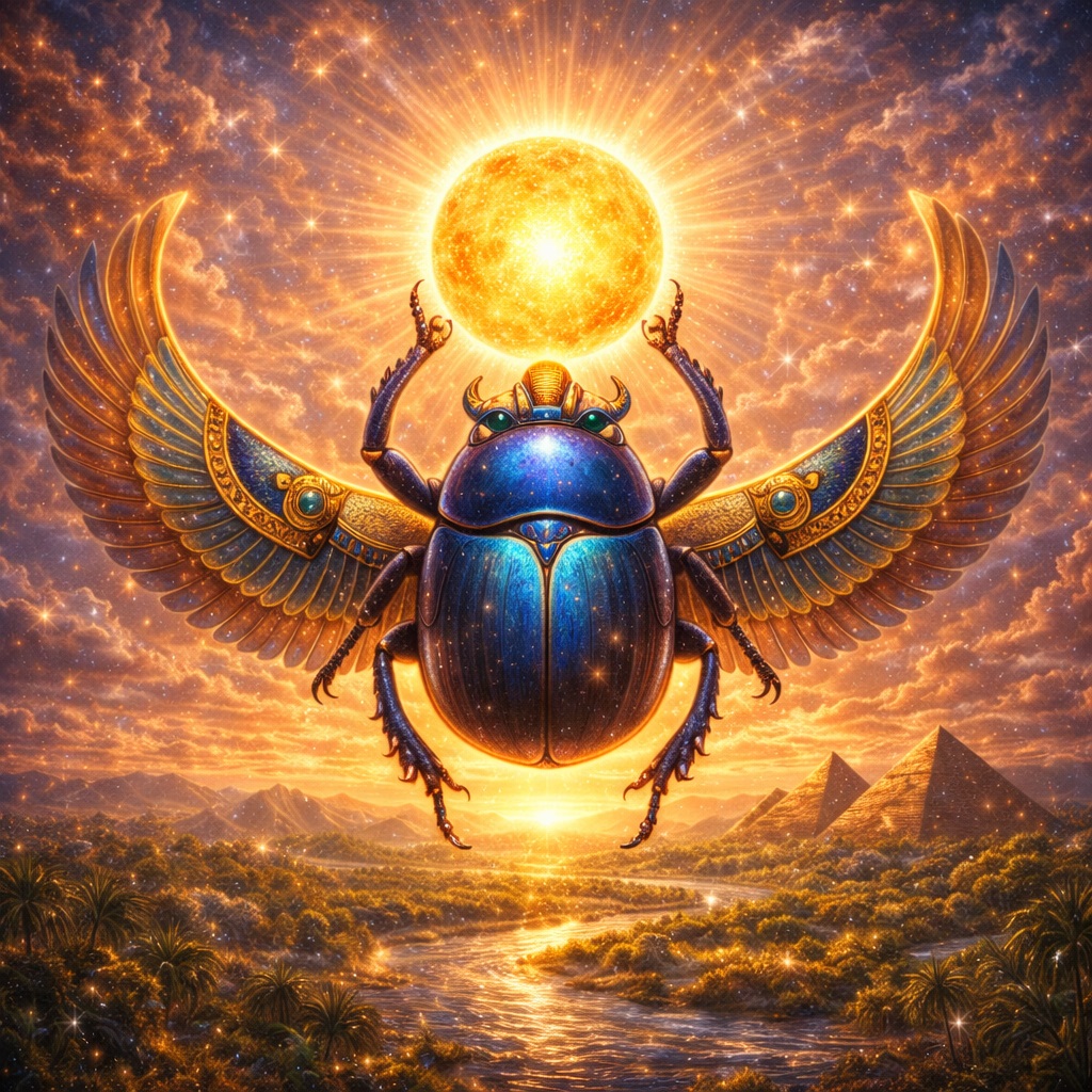 Для египтянина это было не мелкое природное наблюдение, а откровение. Маленькое создание повторяет великий закон космоса: из тьмы рождается свет, из закрытого — живое, из смерти — новое бытие. Именно поэтому скарабей стал священным знаком Хепри.