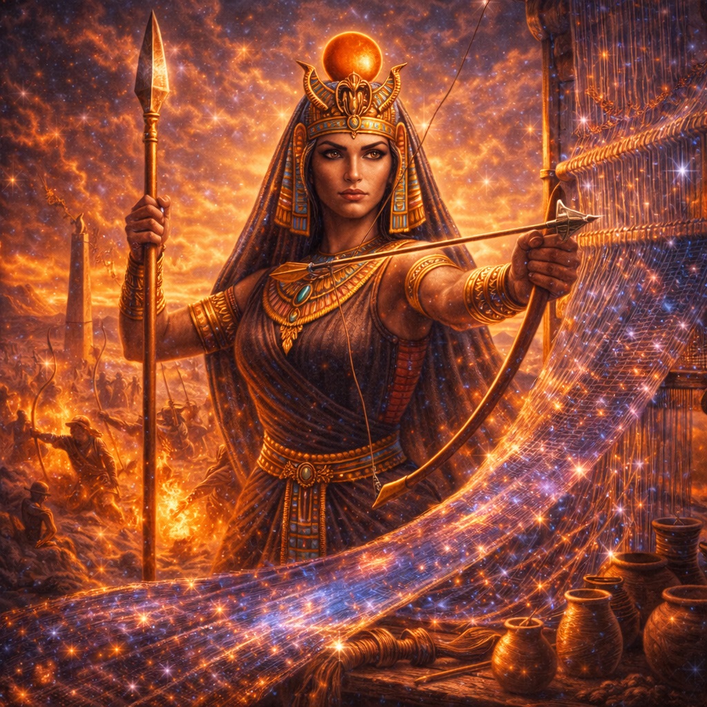 Нейт — одна из самых древних и самых недооценённых богинь египетского пантеона. Она соединяет в себе то, что кажется несовместимым: войну и ткачество, материнство и стратегию, ремесло и космическое созидание. Но именно в этой странной цельности и заключается её истинное величие.