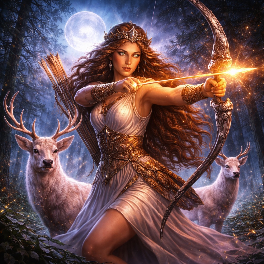Она не правит морями и не метает молнии. Она действует иначе. В её руках лук — оружие охотника. И каждая её стрела — символ божественного возмездия.
