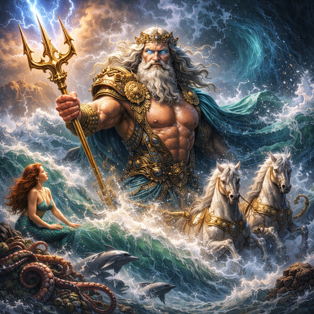 Он управлял штормами, бурями и землетрясениями. Его трезубец мог расколоть землю, поднять волны высотой с горы или затопить целые города. Даже олимпийцы понимали: если морской бог выйдет из равновесия, последствия коснутся всех.