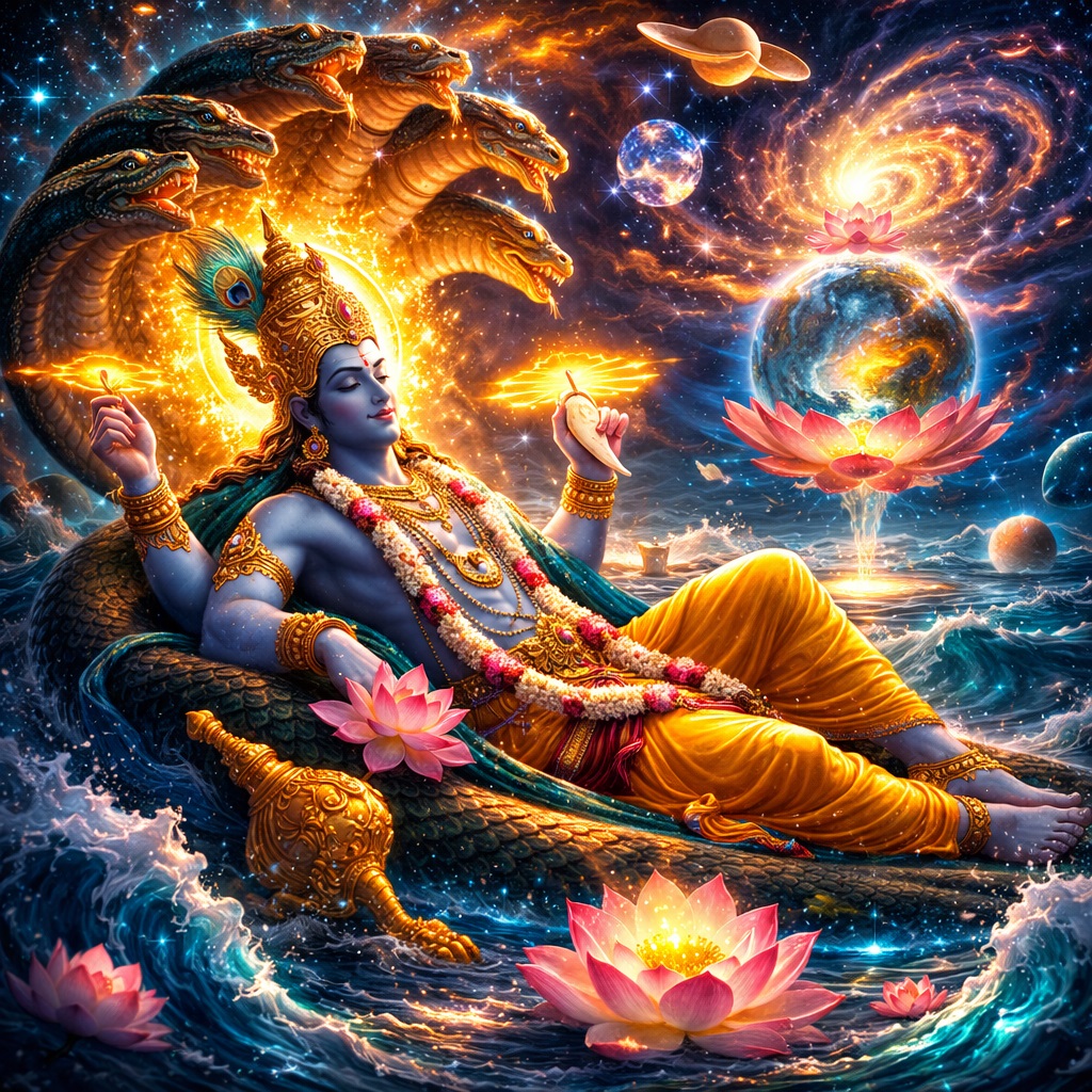 Это крайне важная идея. Мир не возникает из суеты. Он не рождается из спешки. Он появляется из божественной глубины, из состояния, в котором всё ещё едино, всё ещё скрыто, всё ещё не вышло в форму. Океан Нараяны — это не хаос в грубом смысле, а скорее бесконечная возможность. Всё уже есть, но ещё не проявилось.