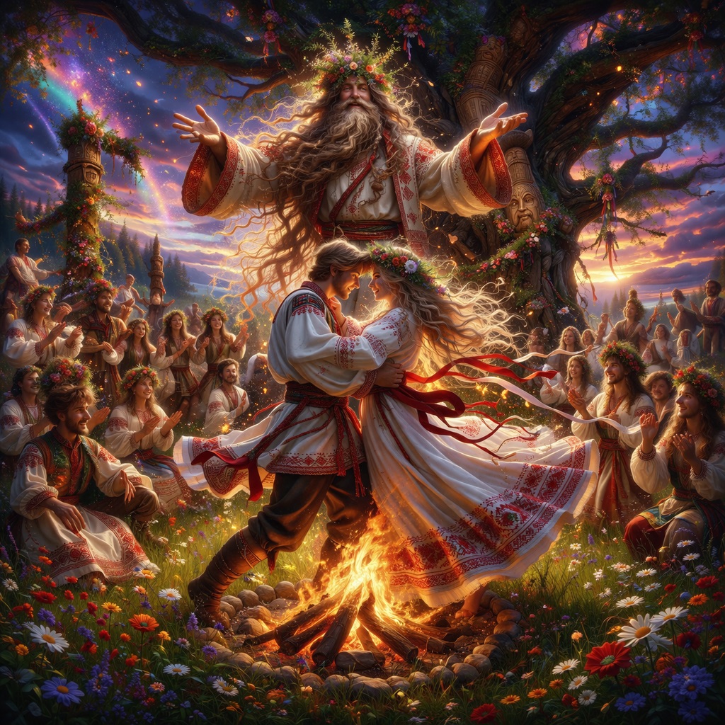 Вот здесь и появляется Полель — как образ не юношеской влюбленности, а узаконенного союза, брачного перехода, праздника, в котором веселье скрывает напряжение, а игра прикрывает огромную силу обряда. Если Лелю и подобным образам поздняя традиция охотнее отдавала первую любовь, трепет, нежность и девичьи мечты, то Полель в культурном воображении чаще тянется именно к свадьбе, к брачной мере, к устойчивому соединению, к тому моменту, когда чувство уже должно выдержать вес дома, рода и общего будущего. Это не лирика сада. Это уже порог семьи. И порог этот никогда не был простым.