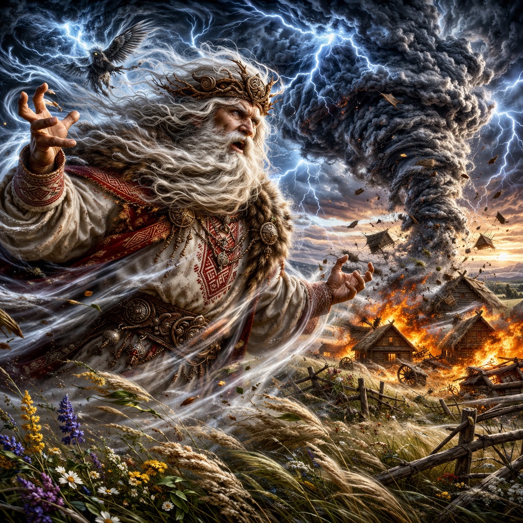 Именно поэтому образ Позвизда так цепляет. Ветер вообще редко воспринимают всерьез, пока он не начинает ломать крыши, валить деревья, выдувать тепло из дома и выбивать из человека остатки самоуверенности. Тогда внезапно выясняется, что воздух — это не пустота. Что невидимое способно уничтожать не хуже огня. Что разрушение приходит не всегда в виде удара меча или пламени пожара. Иногда оно приходит в виде гула, свиста, давления, порыва, который сначала кажется просто неприятным, а потом превращает порядок в хаос.