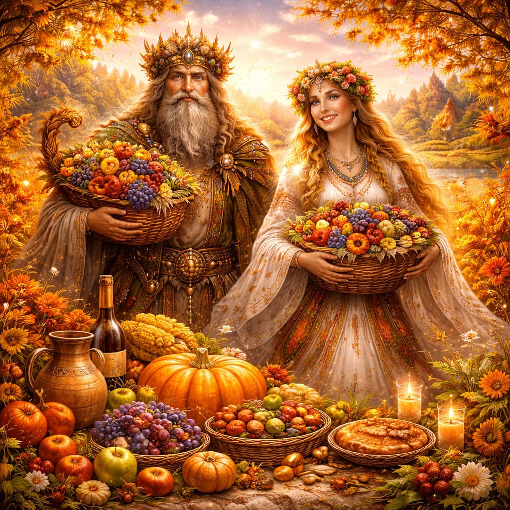 Весной человек надеется. Летом работает на пределе. Осенью он наконец видит, что дал год на самом деле. Поле уже не обещает урожай — оно его отдает или не отдает. Земля уже не просыпается — она устает. Солнце уже не нарастает — оно медленно сдает высоту. Дом уже не мечтает о будущем — он считает, хватит ли зерна, сена, соли, мяса и сил на зиму. Именно поэтому осень у славян — это не расслабление после труда, а сезон тяжелейшей правды. Будет изобилие — дом выстоит. Не будет — вся красота золотой листвы быстро закончится голодной ночью. В народно-религиозном славянском круге образы изобилия, доброй доли и богатства вообще тесно связаны с сезонным мышлением и с идеей “полного” мира, а не просто удачного пейзажа.