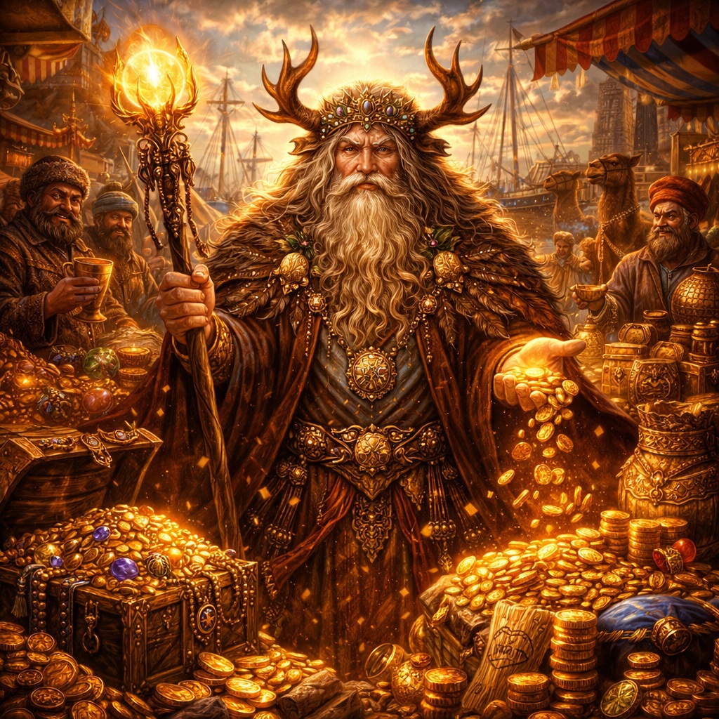 Позднее, когда обмен усложняется, а богатство начинает измеряться не только стадом, но и золотом, мехами, товаром и рынком, велесовская сила естественно расширяется. Он становится покровителем не только владельца скота, но и того, кто умеет этот достаток превращать в обмен, сделку, путь и прибыль. Поэтому связь Велеса с торговой средой выглядит не натяжкой, а почти естественным продолжением его древней сути.