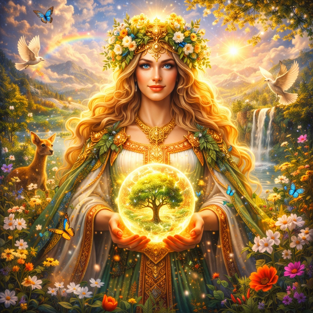 Она не гремит молниями и не держит меч. Её власть тише — и потому глубже. Она в дыхании, в движении крови, в росте травы, в каждом импульсе жизни.