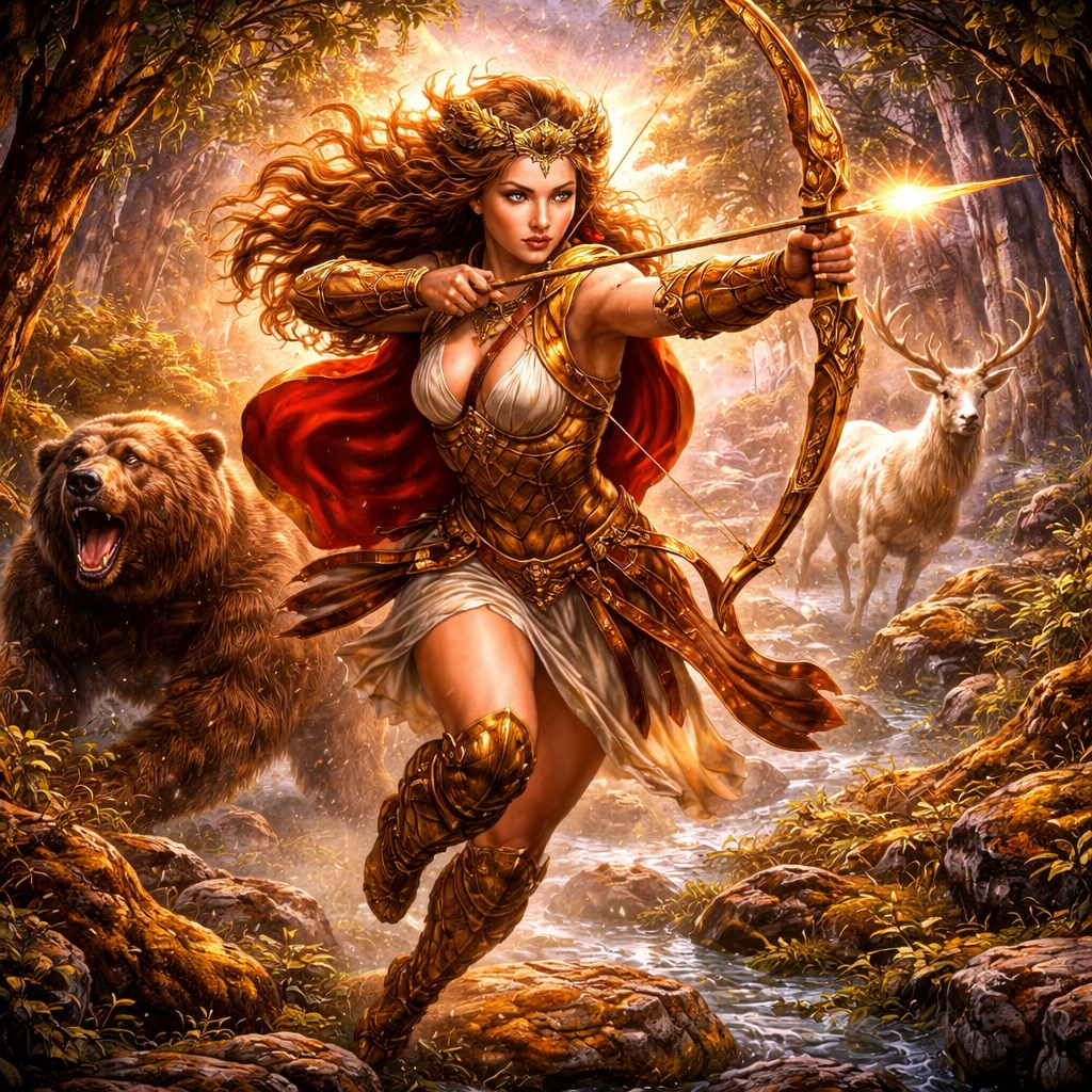 Именно поэтому Аталанта так тесно связана с охотой, быстротой, телесной свободой и почти звериной точностью движений. Она не просто научилась стрелять из лука или бегать быстрее других. Она выросла вне привычного деления на «мужское» и «женское» в бытовом смысле. Её тело и воля формировались в пространстве необходимости, а не приличий. Она не украшение двора. Она ребёнок границы между человеком и природой. И в этом — источник её особой силы.