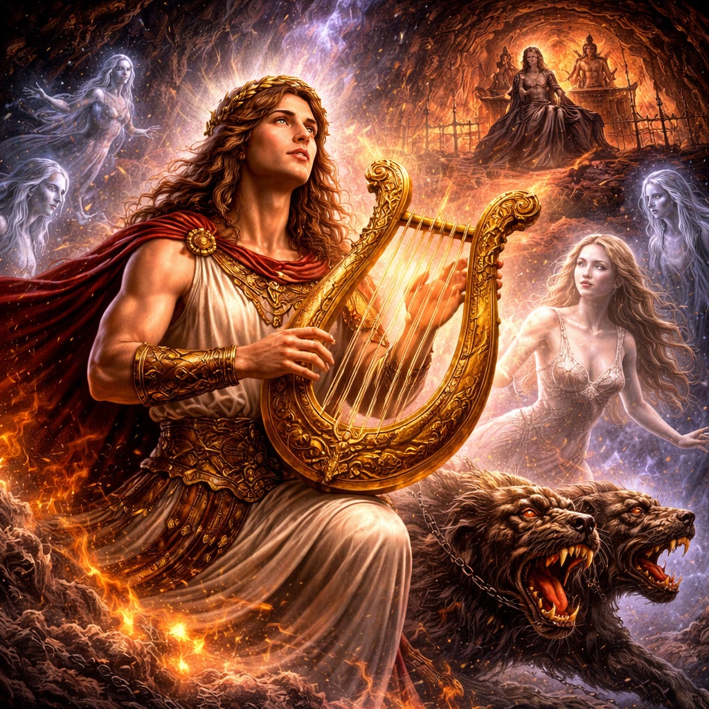 Потому что здесь любовь перестаёт быть просто чувством и становится действием против самого миропорядка. Орфей не принимает смерть как окончательный закон. Он не плачет на могиле, не строит памятник, не смиряется. Он делает то, на что в мифологии решаются единицы: идёт в подземный мир живым. World History и Britannica сходятся в том, что он сумел пройти мимо Харона и Цербера именно силой музыки, а затем убедил властителей мёртвых отпустить Евридику обратно.