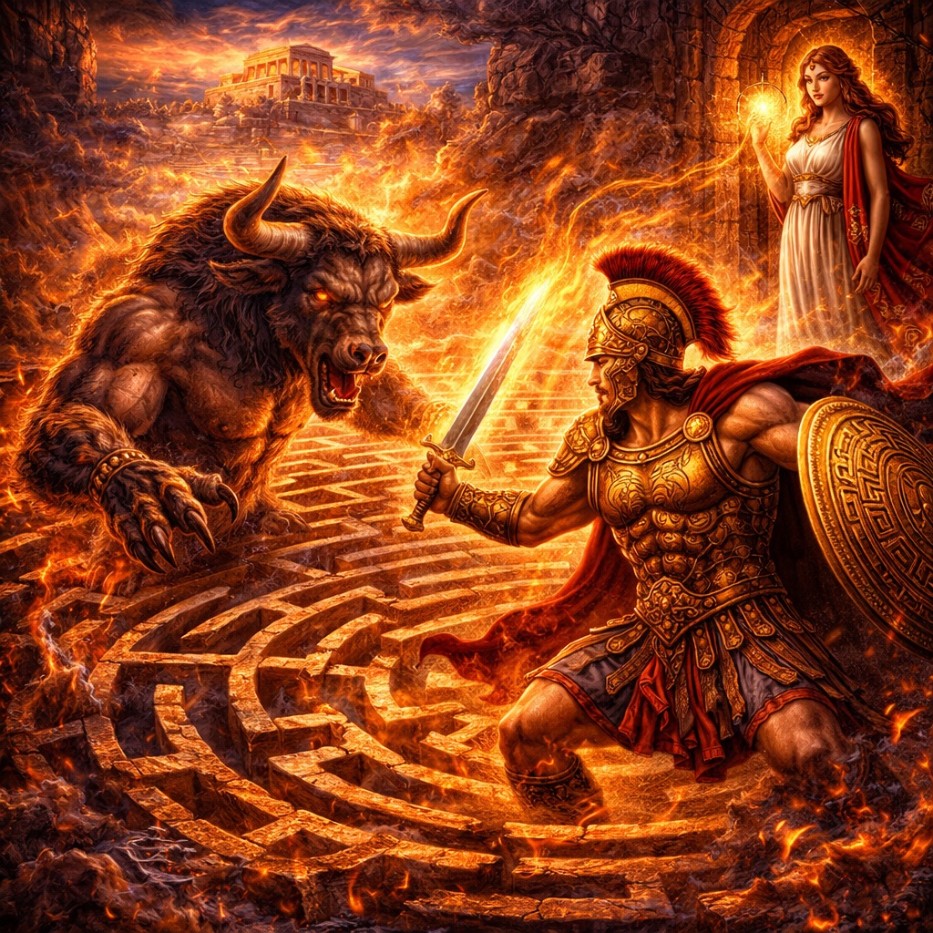 Но вот где начинается настоящая сила этого мифа: история Тесея — это не просто рассказ о чудовище и смелом герое. Это легенда о прохождении через тьму, о спуске в запутанное пространство страха, о схватке с тем, что скрыто в самом центре чужой власти, и о возвращении назад уже другим человеком. Лабиринт в этом сюжете важен не меньше самого Минотавра. Он не декорация. Он символ. И именно поэтому миф о Тесее пережил века: люди слишком хорошо чувствуют, что иногда главный враг прячется не на поле битвы, а в самой глубине запутанного мира, где легко потерять себя.