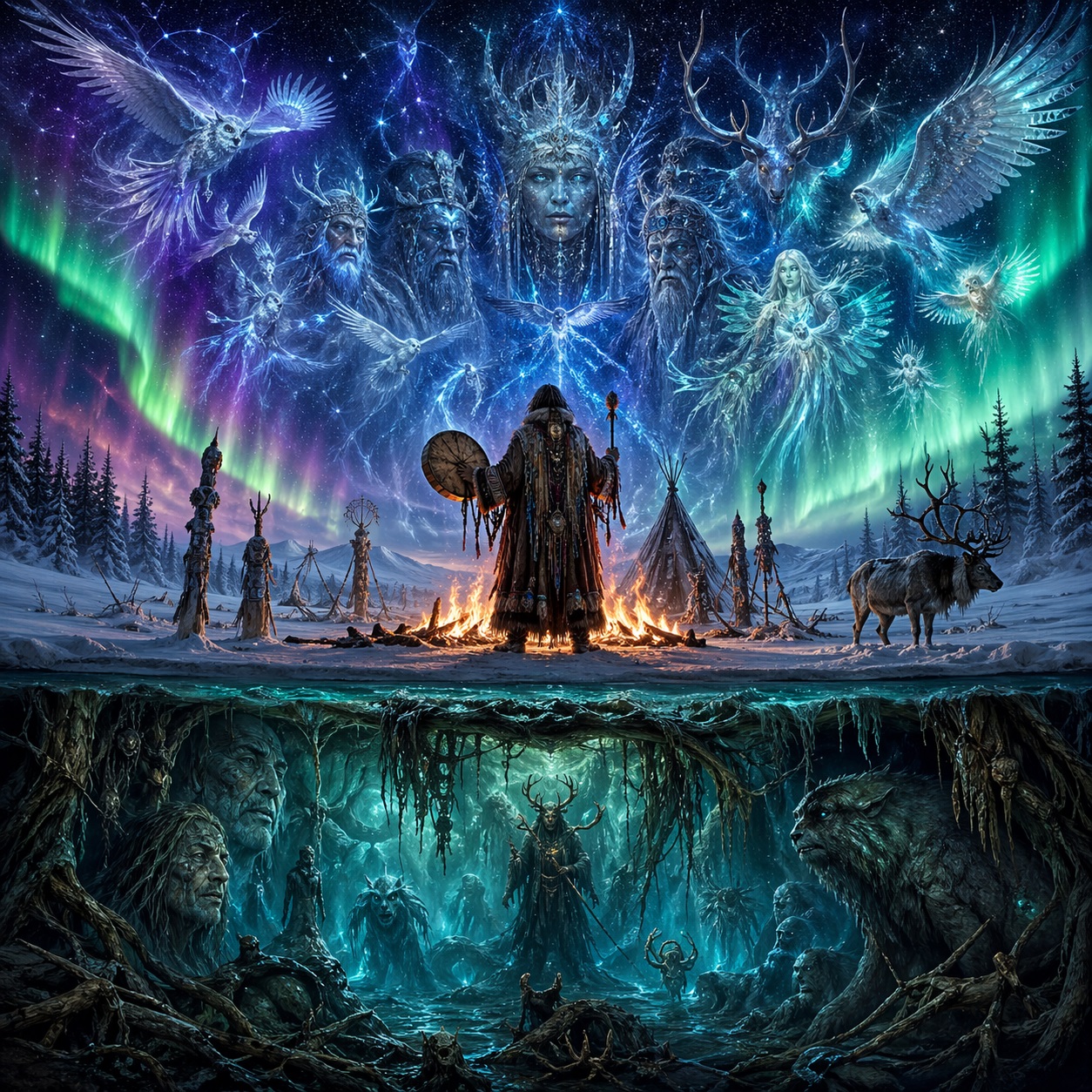 Очень показателен и северный образ многослойного неба. У саха — девять небес. У угорских народов и у ряда арктических традиций — семь. Это не просто красивые числа. Это указание на дистанцию. Между человеком и высшей силой лежат слои, через которые не пройти наивным желанием. Именно поэтому в северном мире так важен шаман: он нужен потому, что верхний мир не открыт напрямую. Если бы небесные духи были просто добрыми покровителями, никакой сложной дороги наверх не понадобилось бы. Но дорога есть, и она тяжела, потому что верхний мир — не “утешение”, а территория чужой власти.